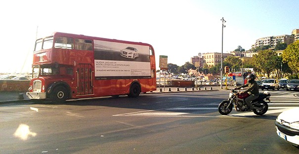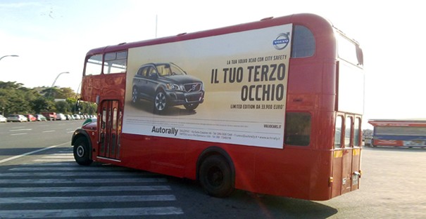 Un pullman inglese a due piani che nei primi anni sessanta prestava regolarmente servizio a Londra, restaurato e modificato per uso pubblicitario, è quotidianamente in circolazione per promuovere le più recenti novità di prodotto dei Marchi che rappresentiamo.